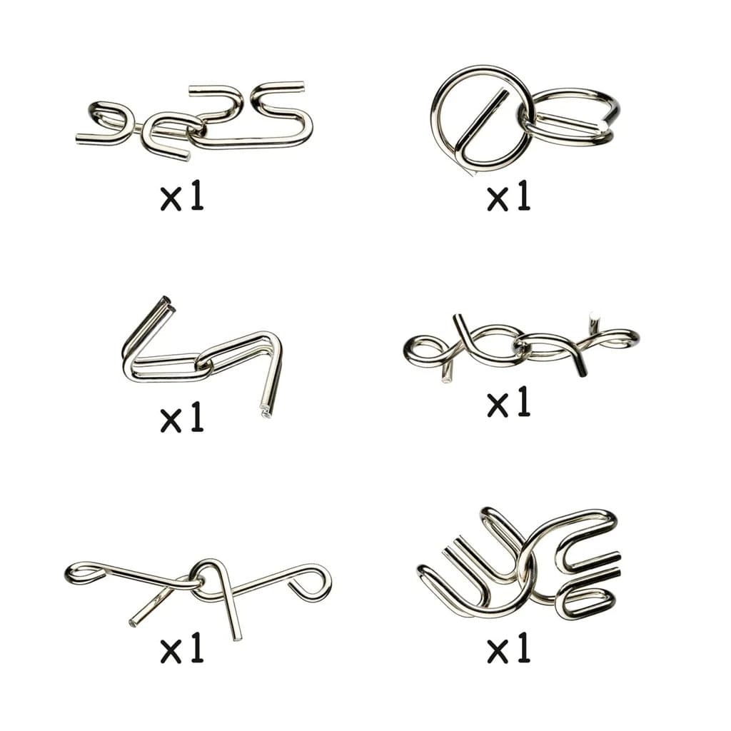 Contains - 6 metal puzzles. Puzzle solutions shown in pictures and in 10 languages.